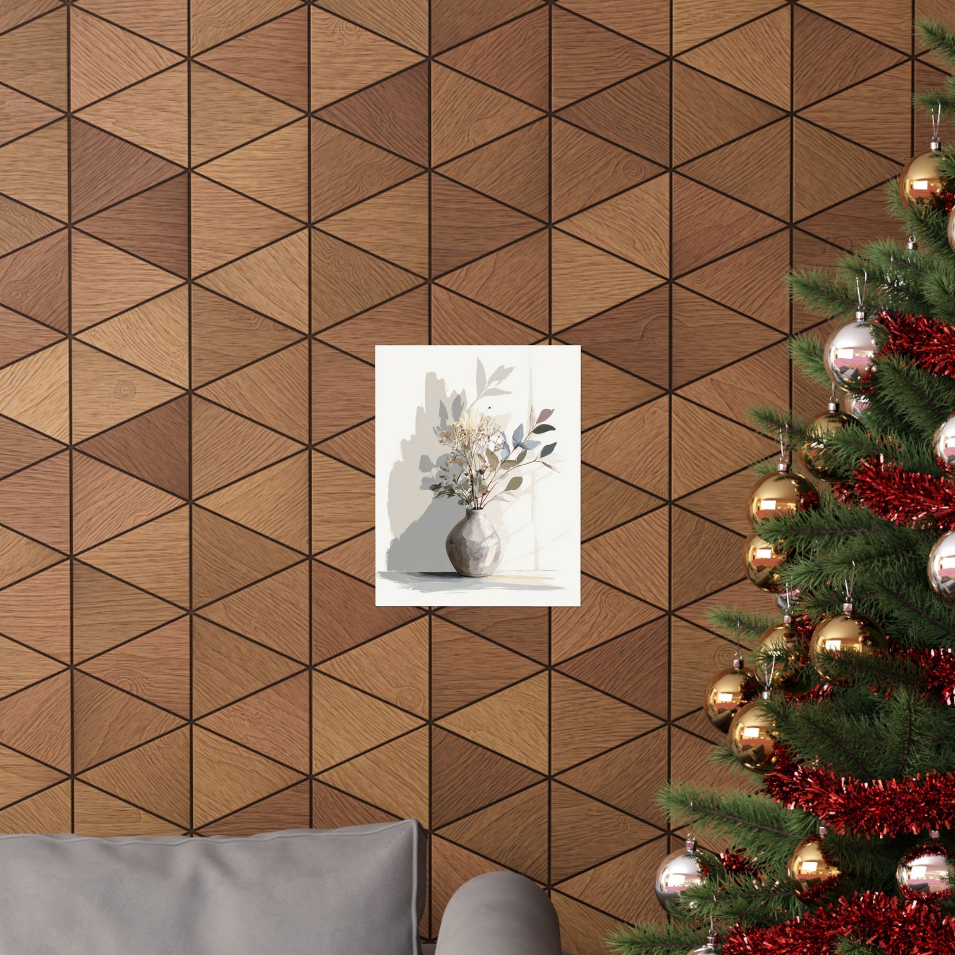 A soft, sunlit still life printed on museum-grade matte paper. This vertical 11 × 14 poster captures a quiet interior moment—a ceramic vase holding delicate dried stems, layered shadows, and gentle brushwork rendered in muted neutrals and dusty blue-gray tones. The composition feels calm and intentional, designed to sit comfortably in a space rather than command it.